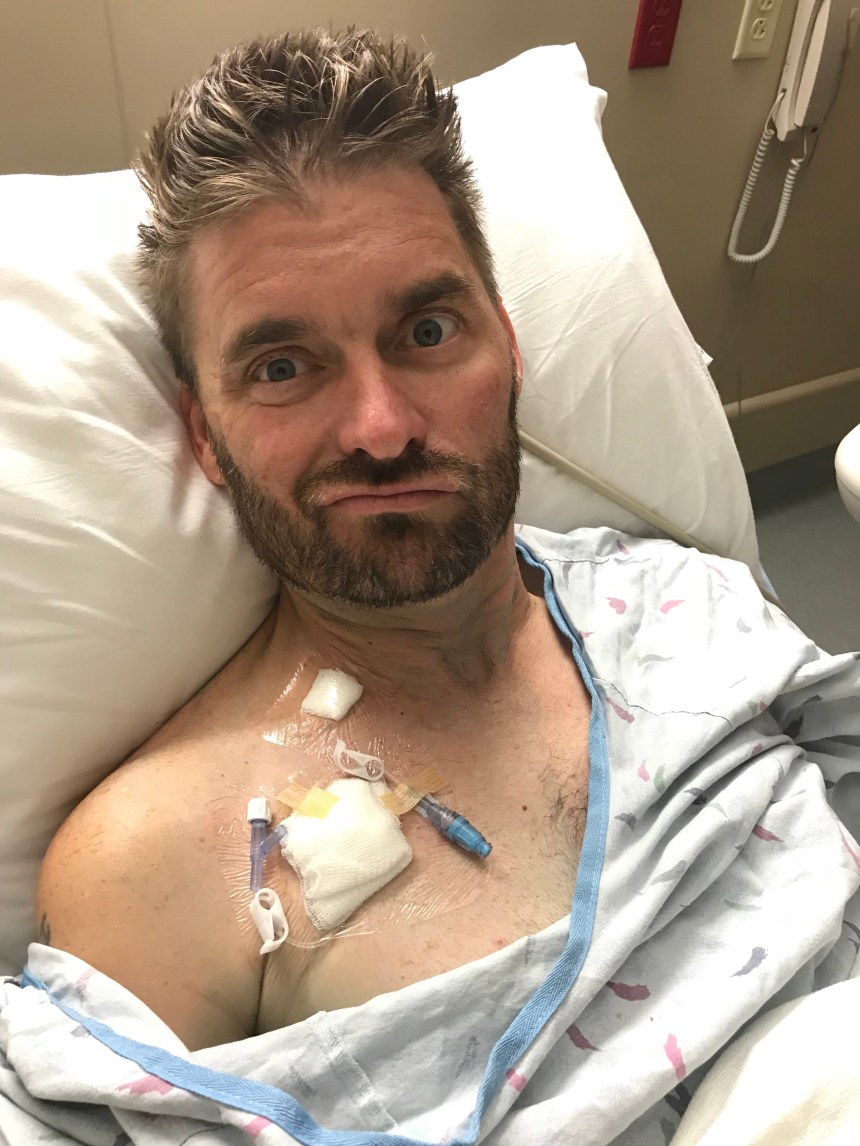 As I’ve mentioned before, Justin suffers from extreme anxiety when it comes to blood draws, and rightfully so. Several years ago, he was hospitalized on three separate occasions for DVT (deep vein thrombosis), before we even knew that the pesky cancer was even there. Anyhoo, while hospitalized, Justin had blood draws every four hours for days at a time. His veins are terribly scarred and difficult to access. This in turn, makes even the simplest appointment an all out nightmare. Getting the port today will hopefully alleviate much of this stress.