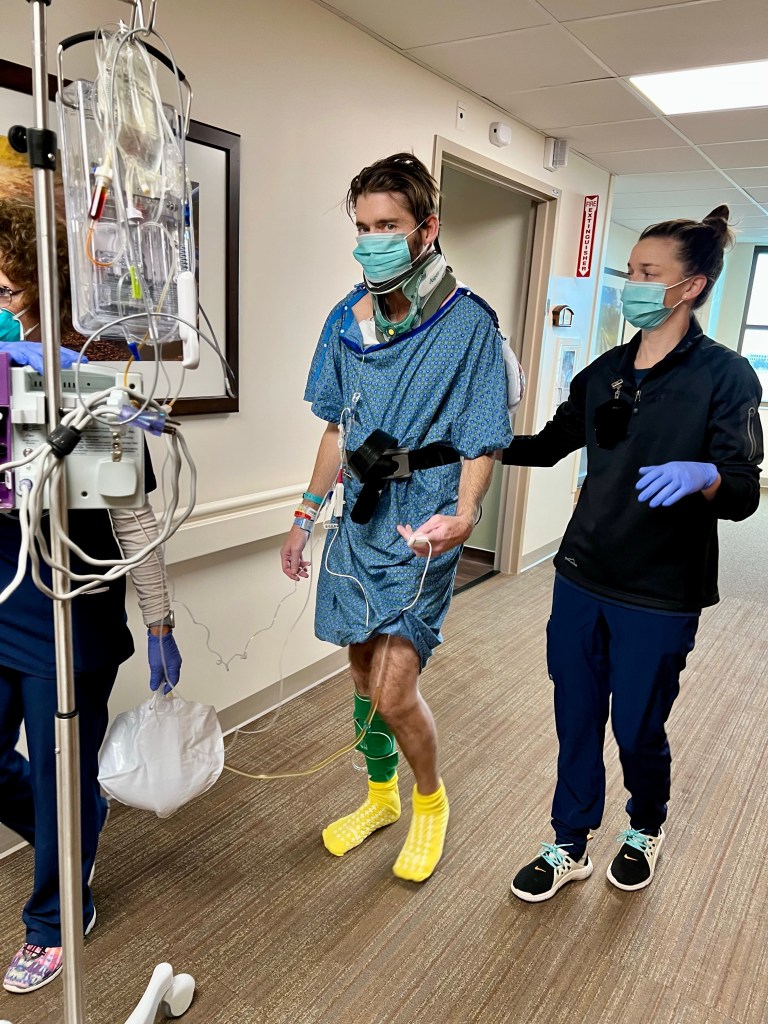 I think one of Justin’s biggest hurdles right now is psychological. He’s very afraid of moving his neck … like, at all … understandably. He needs to learn to trust the brace and his new “hardware.” It’ll be a lengthy recovery, but one we’re all in on! Please send him your support, it really does lift his spirits!